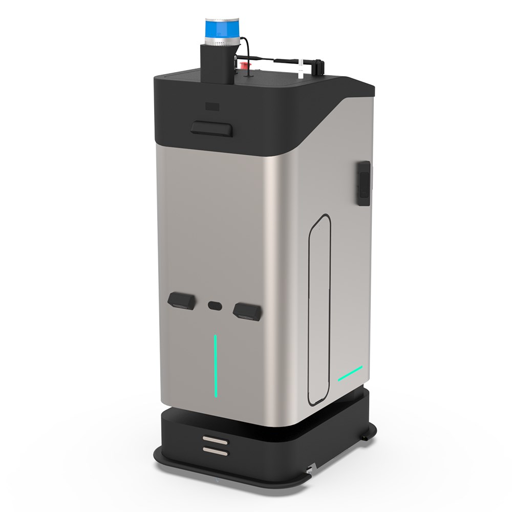 Automatic return to charging station upon low battery, with the system dispatching other robots to continue working.